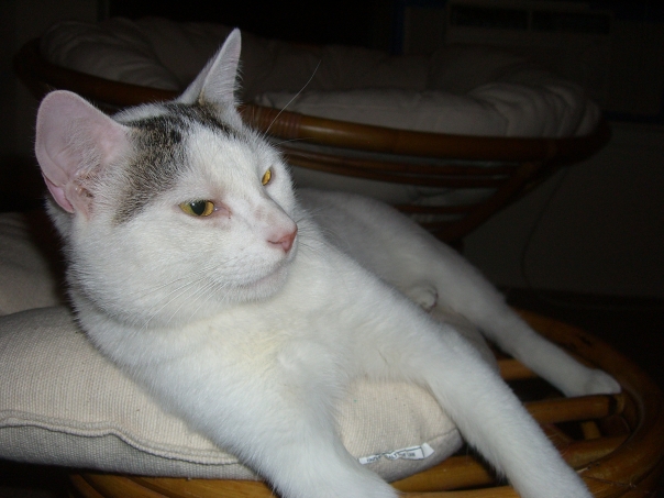 the furry white feline eases back on her soft cushioned bed, daring anyone to remove her.