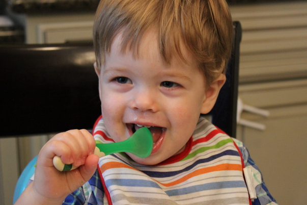 A young child with a bib, sitting on a chair and chewing on a spoon.