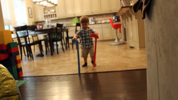 Toddler in a blue plaid shirt holding a red hockey stick and a blue hockey stick.