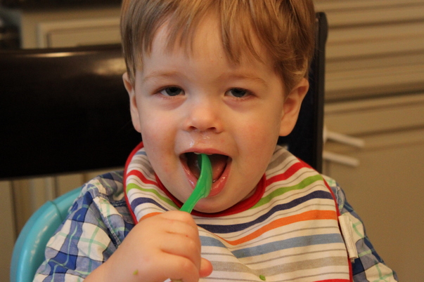 THIS IS A PICTURE OF A YOUNG HAPPY BOY WITH S STRIPED BIB EATING WITH A GREEN SPOON