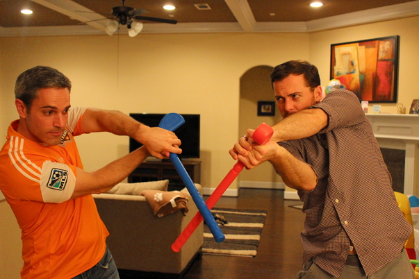 A man in an orange shirt holds a blue toy near a man holding a red toy.