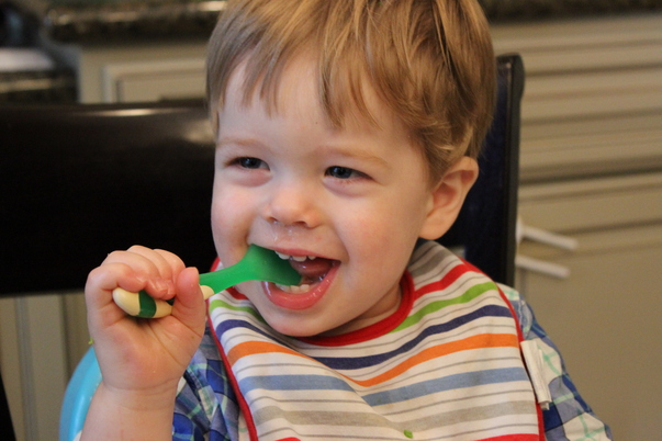 A toddler in a striped bib smiles while he eats from a green spoon.