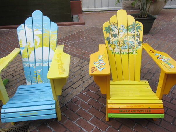 The two blue,yellow, green and orange painted wood chaise lounged are side by side on the brick patio.