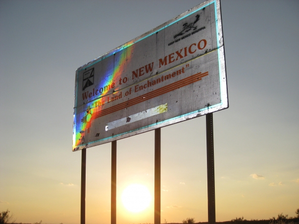 A rainbow streaked sign on an otherwise stark landscape offers a warm welcome to travelers entering New Mexico.