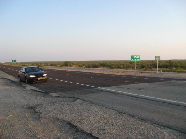 A two-lane highway stretches from the Texas state border far off into the distance on a flat landscape beneath a pale blue sky. A black compact car is parked in the shoulder lande right on the border, where the pavement changes from a weathered, gray asphalt to a newer, black asphalt.