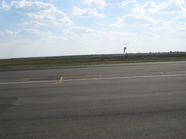 A windless sunny day with a blue mildly cloudy sky at an airport
