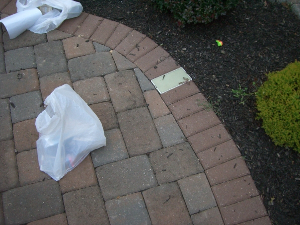 Brick floors in the backyard with two bags outside. There is one white brick along the edge of the brick floor.