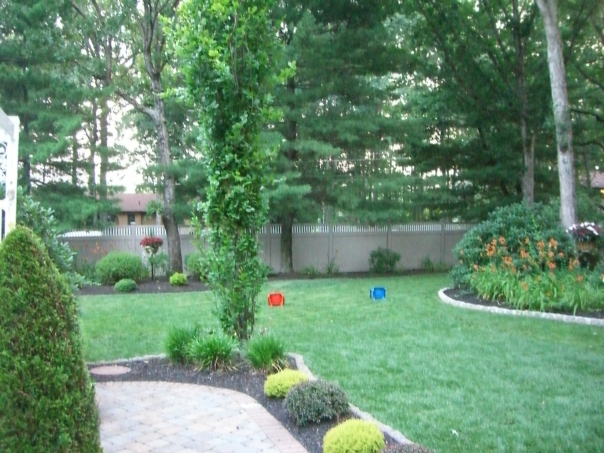 A view of a home backyard, with patio, green trees, green grass, and a white fence.