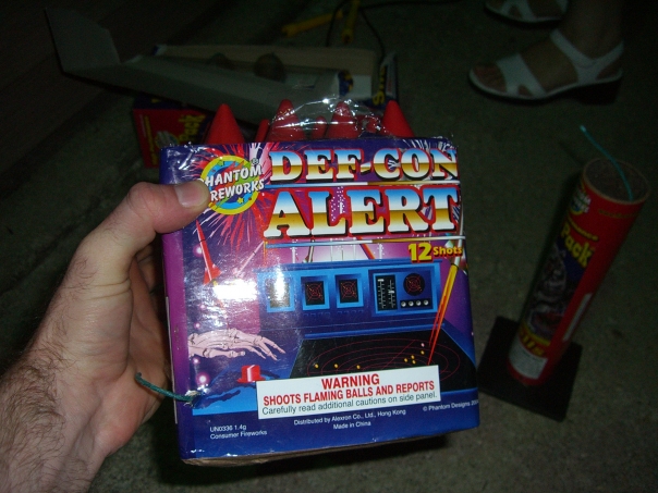 A man with a hairy arm is holding "def con alert" fireworks in their packaging in his hand, and there's another firework in the background in shadow.