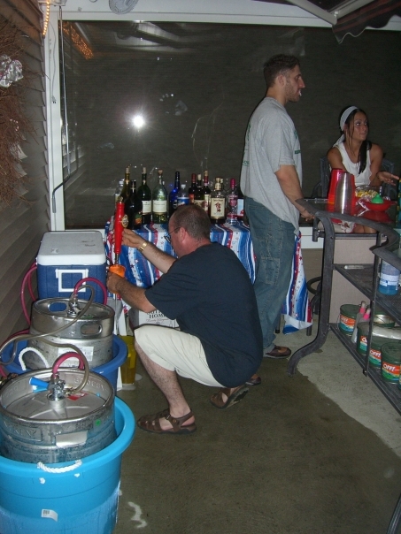 picture of 3 people at a party by the kegs where one guy is getting a cup of beer