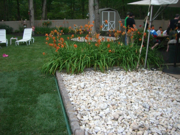Outdoor area with green grass, area with stones and tall orange lilies growing.