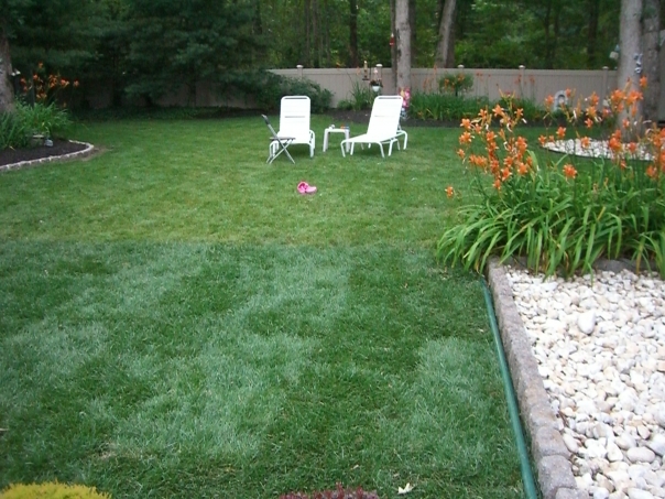lush manicured green lawn in someones back yard with lounge chairs and table in back ground