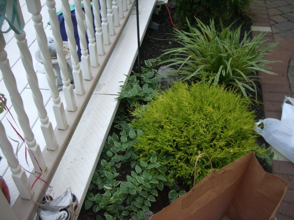 picture of a a garden patch in front of a white porch