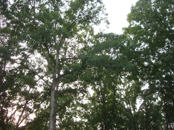 Tall trees with bright green leaves create a canopy blocking the sun