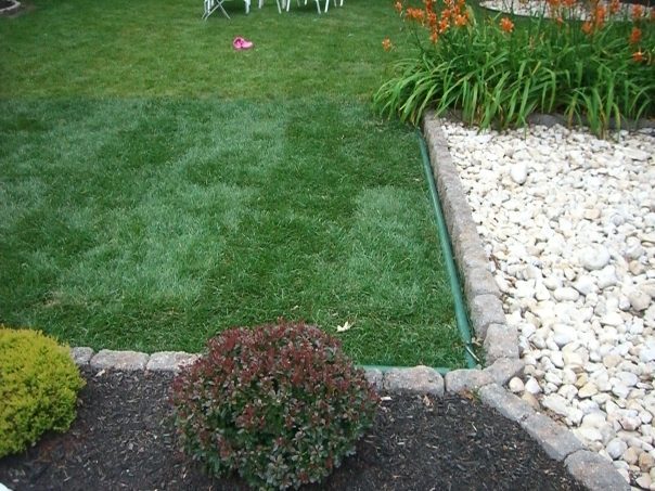 A person's backyard consists of orange flowers, various bushes, and dark green grass.