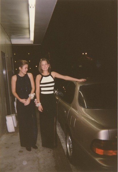The two women are standing next to the car in black and white dresses. |