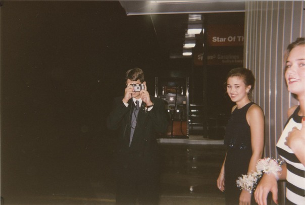 A man dressed up in a coat is taking a picture while two girls are watching. |