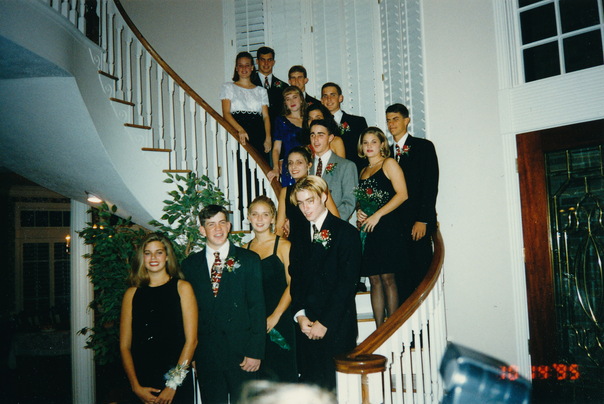 This photo shows a group of teen-agers wearing dressy attire for a prom or formal dance, posed in couples on a very nice, winding staircase. |