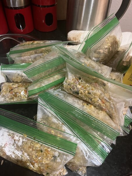 It's all cooked properly, mixed together, and then portioned out into 5-6oz bags and frozen.