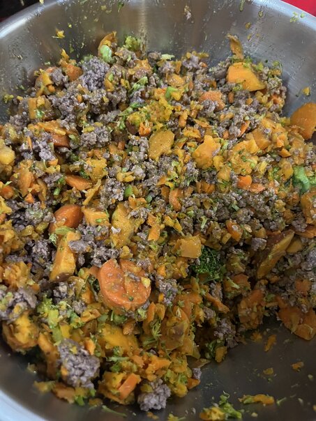 I've used a variety of meats, but the basic formula is 3 pounds of meat and then 2c of brown rice, 2c of carrots, 2c of broccoli, 2c of sweet potato, 2c fresh spinach, and usually one or two diced apples.