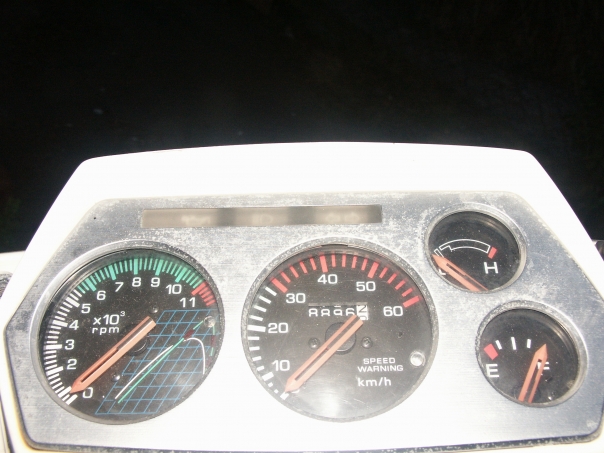 The dash board has many dials that are covered with numbers and tick marks.