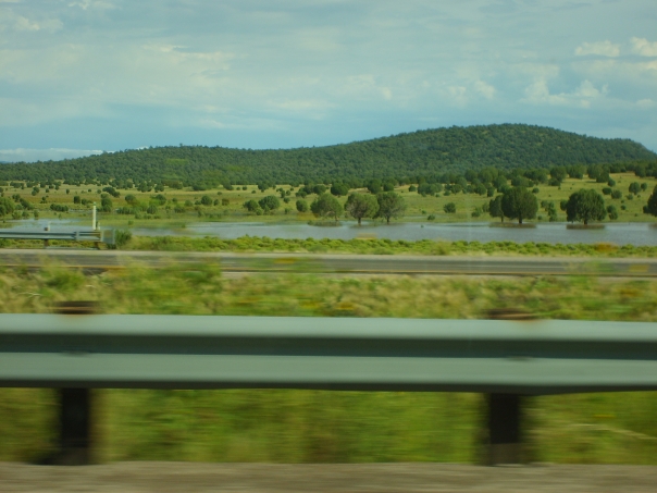 lake & mountaind view taken while moving on road with blurry guardrail in foreground