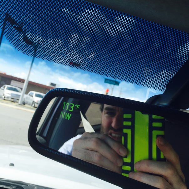 A grimacing, beard man takes a selfie of himself using the rear view mirror inside his vehicle.