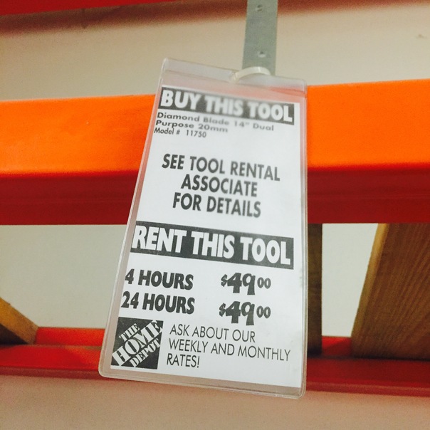 One price tag from home depot is secured to a pole with a white zip tie letting us know that renting for four hours is the same price as renting for 24 hours.
