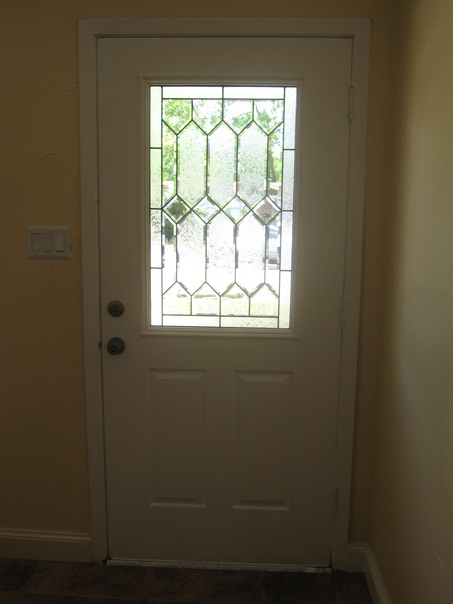 The exterior door is painted white and has two locks and a decorative glass window pane.