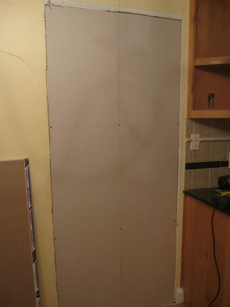 A doorway has been covered up with a piece of drywall. The drywall is still unfinished and no joint compound has yet been applied, leaving the screws on the drywall and ragged edges of the old doorway exposed.