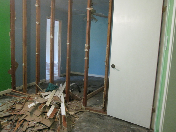 A house is ruined as the walls are being town down inside