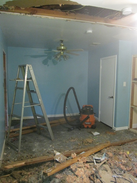 AN INTERIOR SHOT SHOWING A DEMOLITION/REMODELING PROJECT OF A BLUE ROOM.