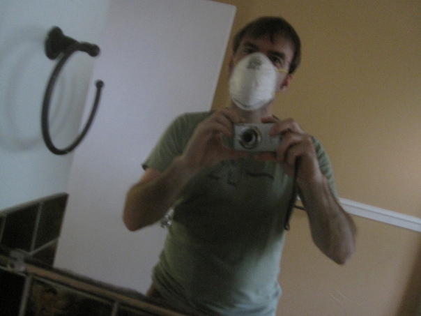 A white male wearing a dust mask taking a selfie with a point-and-shoot camera.