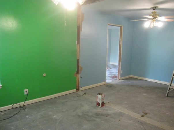 This appears to be a room with a green wall and a light blue wall that is in the middle of being remodeled.