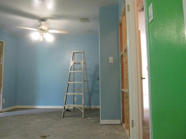A light blue unfinished room with a ladder on the sub floor and one bright green accent wall.