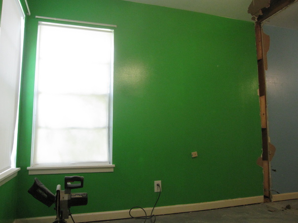 Green walled room with two windows that is being renovated.
