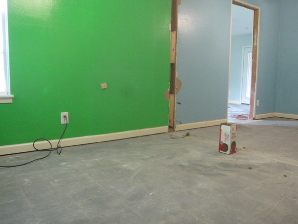 There is a room under construction that has a green wall.