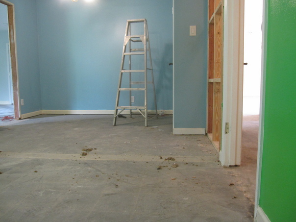Pale blue painted room with white trim and a concrete floor with a ladder in the corner.
