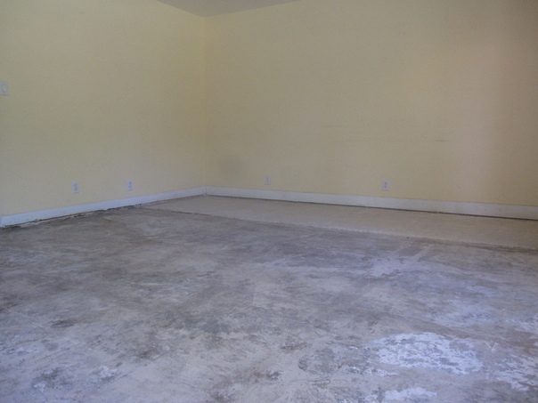 There is an empty room with beige walls and a grey uncarpeted floor