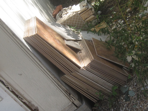 This appears to be some sort of construction site with several boards stacked against a wall outside next to some plants.