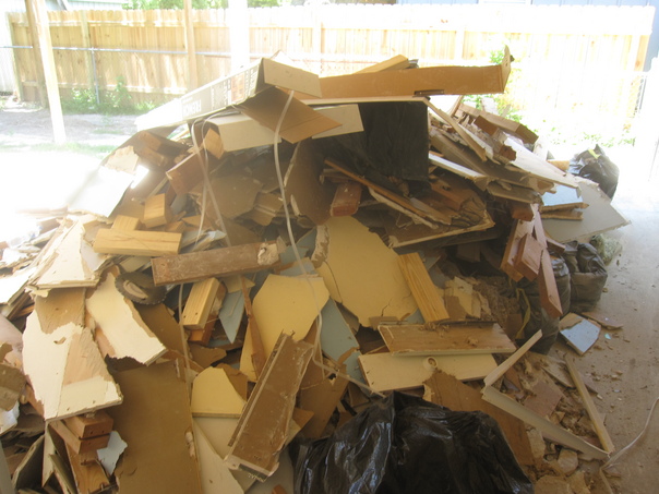 A pile of wood and other debris from a room being remodeled.