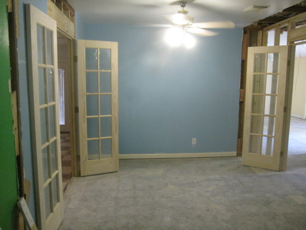 Could be an early development image, this picture shows 2 doors in a home that appears to be in the renovation/home improvement stage.