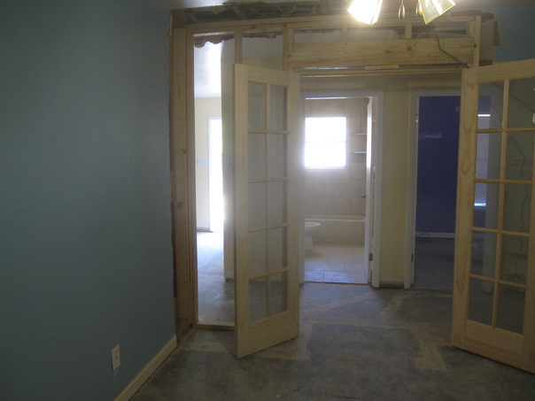 This is a room that appears to be in the middle of being remodeled with French doors.