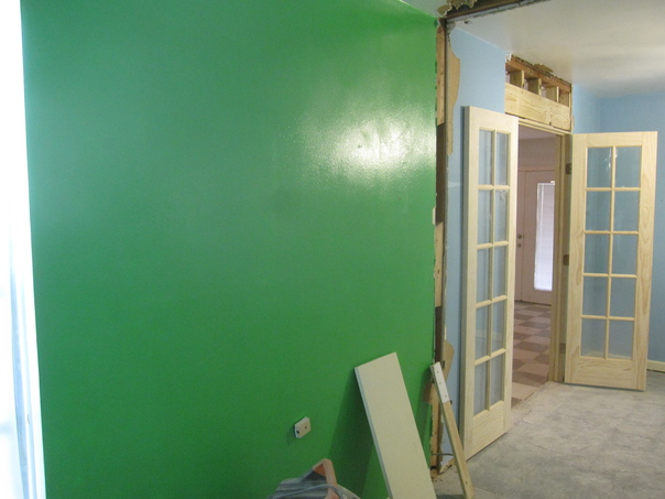There is a room with yellow doors and an accent walk that is painted green in the room