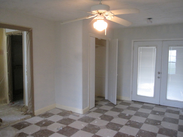 White room with French doors and a checkerboard pattern on the floor.