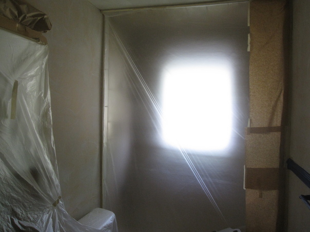 A person is painting in the room the walls are yellow and there is a plastic piece of paper on things in the room