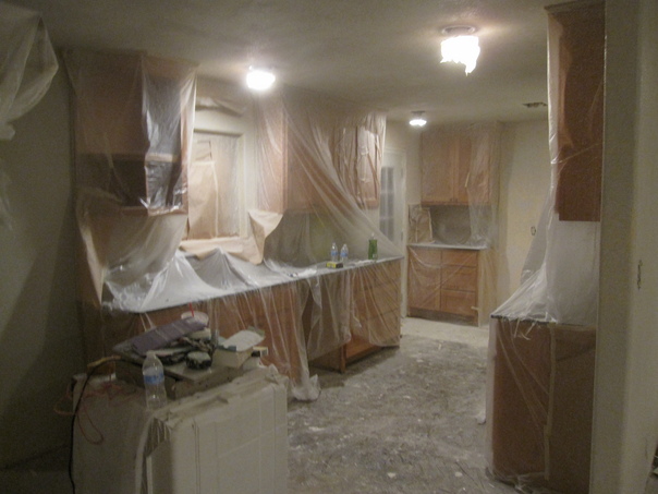 New kitchen cupboards are covered in plastic to protect them while the walls are treated with texture and paint.