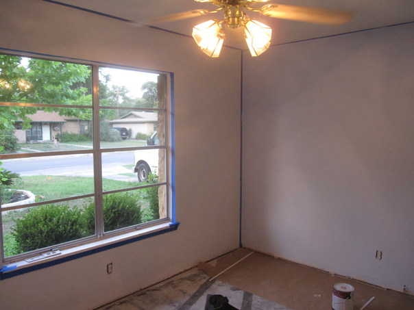 I SEE WHITE WALLS THAT ARE BEING PREPPED WITH TAPE TO GET A NEW FRESH COAT OF PAINT.
