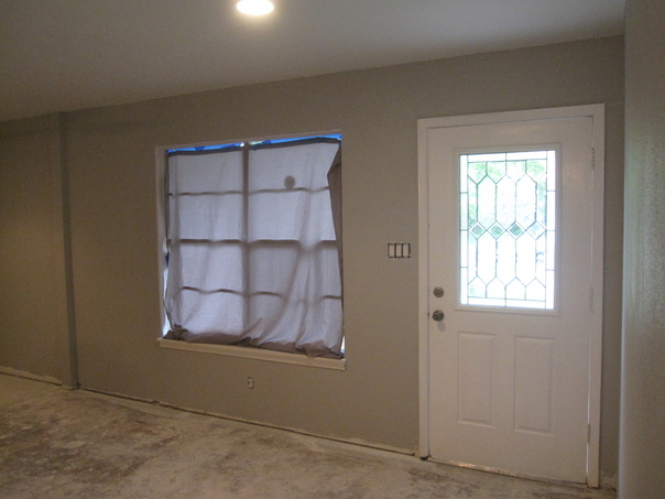 The morning sun shines into the house with the clean door and even the sheet covered window.