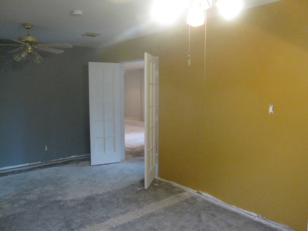 Empty room with overhead light on, one wall grey one wall yellow.